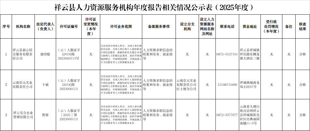 按照《人力资源市场暂行条例》和《云南省人力资源和社会保障厅关于做好人力资源服务行政许可及备案有关工作的通知》(云人社通〔2019〕51号)相关规定,我局组织和指导县内3家经营性人力资源服务机构开展了2025年度报告工作,现将报告情况予以公示,具体情况见附件。任何单位和个人如有异议,请向我局实名反映或举报。举报电话:0872-3132631、0872-3121180。