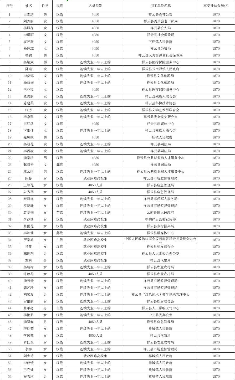根据《云南省财政厅 云南省人力资源和社会保障厅关于印发云南省就业补助资金管理办法的通知》(云财规〔2024〕16号)和《云南省人力资源和社会保障厅 云南省财政厅关于印发云南省城镇公益性岗位管理暂行规定的通知》(云人社通〔2024〕25号)文件精神,经审核,现对符合享受城镇公益性岗位54名人员予以公示,接受广大群众监督,如对享受补贴人员有异议,可通过电话、来信、面谈等形式向县公共就业和人才服务中心反映。