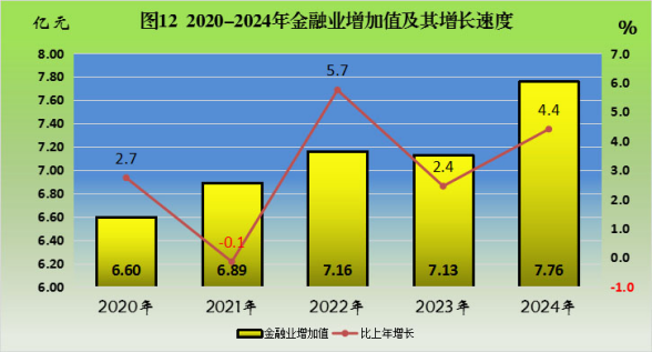 2024年,全县金融业实现增加值7.76亿元,同比增长4.4%。其中:货币金融业服务实现增加值7.11亿元,同比增长4.3%;资本市场服务实现增加值0.01亿元,同比增长14.4%;保险业增加值0.64亿元,同比增长5.2%。