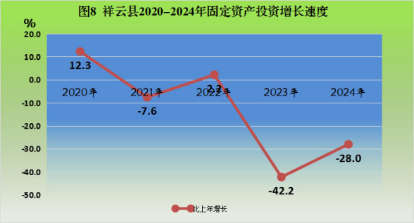 2024年,全县规模以上固定资产投资(含房地产投资)完成51.92亿元,比上年下降28.0%。其中,旅游投资比上年下降53.0%,数字经济投资比上年下降40.2%。分三次产业看,第一产业投资下降27.9%;第二产业投资下降22.8%;第三产业投资下降35.9%。