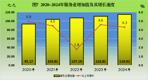 2024年,全县全部服务业增加值实现114.92亿元,同比增长4.3%。其中:批发和零售业增加值27.29亿元,增长2.6%;交通运输仓储和邮政业增加值17.60亿元,增长2.4%;住宿和餐饮业增加值4.59亿元,增长3.9%;金融保险业增加值7.76亿元,增长4.4%;房地产业增加值12.09亿元,增长9.6%;信息传输、软件和信息技术服务业增加值1.70亿元,增长4.8%;租赁和商务服务业增加值3.80亿元,下降1.1%;科学研究和技术服务业增加值1.68亿元,增长8.4%;居民服务、修理和其他服务业增加值3.29亿元,下降5.0%;文化、体育和娱乐业增加值0.67亿元,下降2.6%;其他非营利性服务业增加值31.77亿元,增长5.6%。