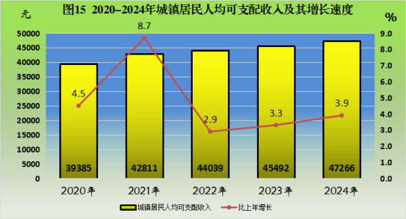 按常驻地分,城镇居民人均可支配收入47266元,同比增长3.9%;农村居民人均可支配收入18991元,同比增长6.5%。