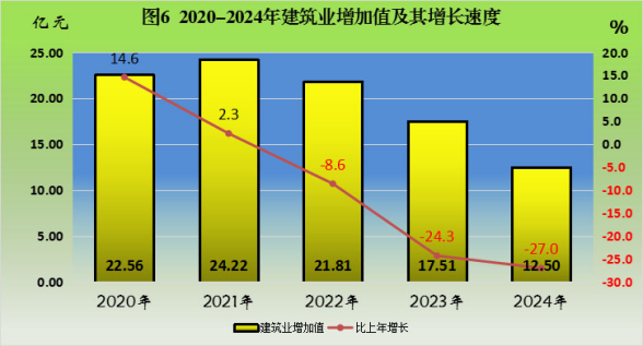 2024年,全县全部建筑业增加值12.50亿元,同比下降27.0%。