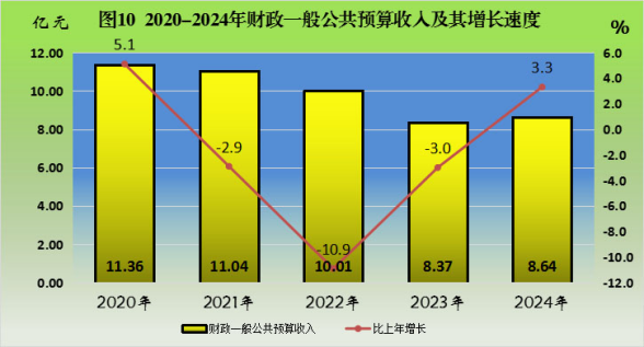 2024年,全县地方一般公共预算收入完成8.64亿元,比2023年增长3.3%。其中:税收收入完成4.52亿元,增长0.8%;非税收入完成4.13亿元,增长6.2%。非税收入占一般公共预算收入的47.7%。