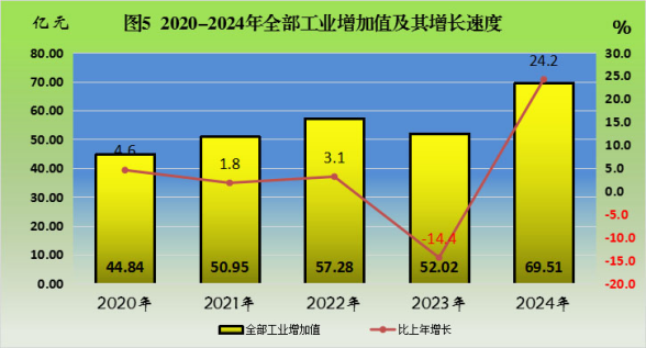 2024年,全县全部工业增加值69.51亿元,同比增长24.2%。