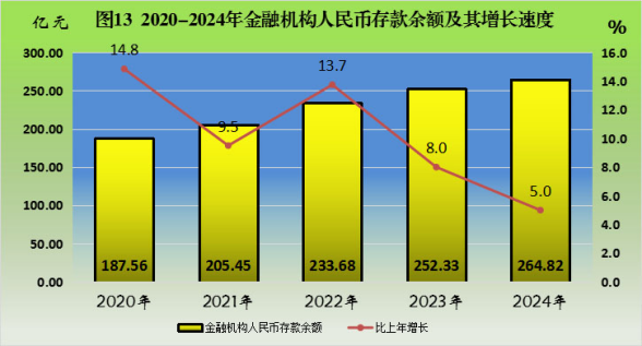 2024年末,全县金融机构人民币存款余额264.82亿元,比年初增加12.49亿元,同比增长5.0%。其中,住户存款219.74亿元,比年初增加18.86亿元,增长9.4%。