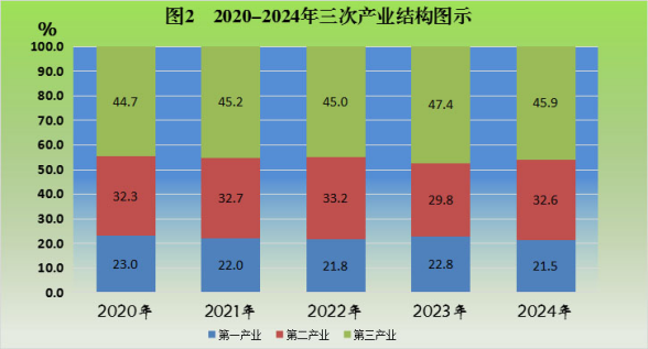 三次产业结构由上年的22.8:29.8:47.4调整为21.5:32.6:45.9,第一产业占比较2023年下降1.3个百分点,第二产业占比较2023年提高2.8个百分点,第三产业占比较2023年下降1.5个百分点。