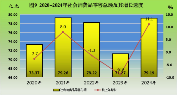 2024年,全县社会消费品零售总额79.19亿元,比上年增长11.1%。