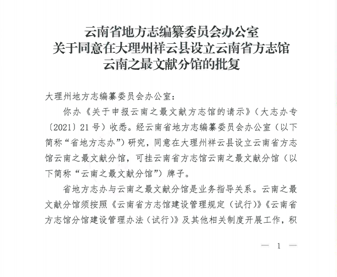 关于在祥云县设立云南省方志馆云南之最文献分馆的批复