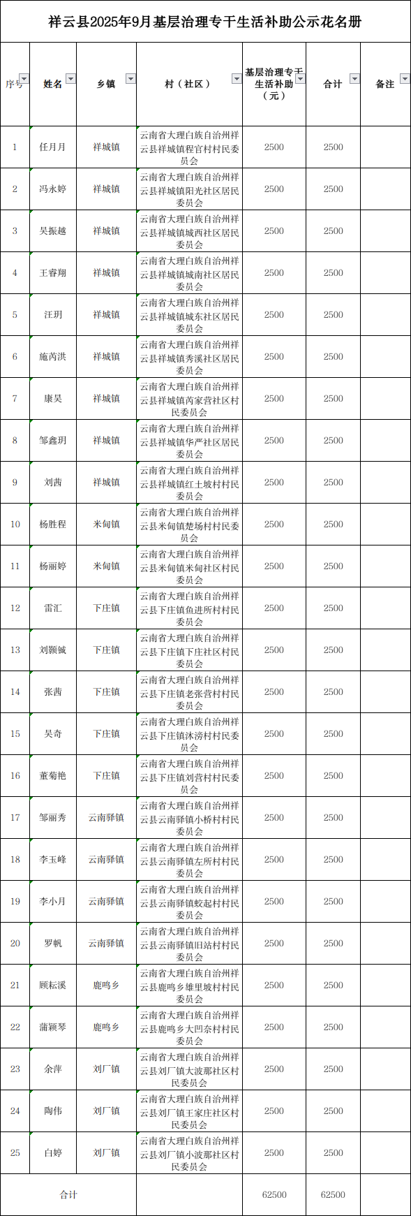 祥云县公共就业和人才服务中心对祥云县2025年9月基层治理专干生活补助公示情况进行为期5天(2026年2月3日至2月7日)的公示,详见下表。公示期间,若对公示对象有异议,请通过来电、来访等方式向我中心反映,联系电话:0872-3120330,联系人:环雪枝。